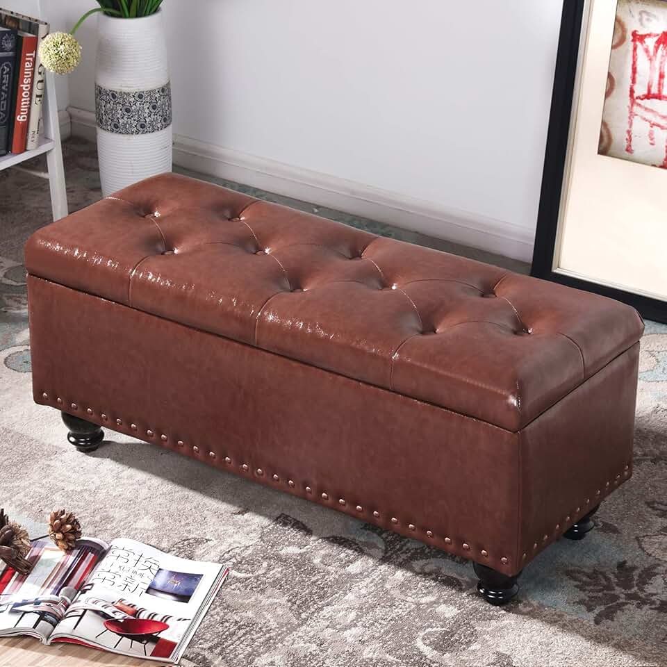 Large Storage with Wooden Legs,Clothing Toys Storage Bench for Bedroom Entryway Load 350lbs,Leather Button Tufted Footstool with Storage-Brown 60x40x43cm(24x16x17inch)