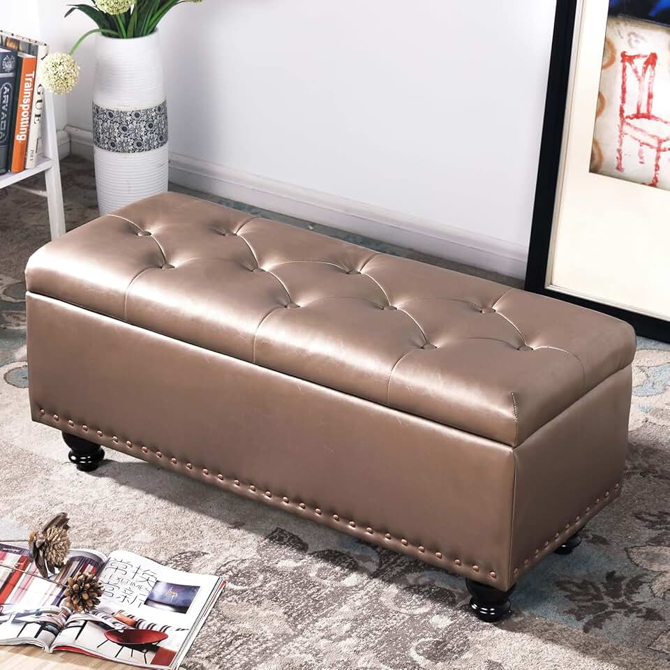 Large Storage with Wooden Legs,Clothing Toys Storage Bench for Bedroom Entryway Load 350lbs,Leather Button Tufted Footstool with Storage-Champagne 80x40x43cm(31x16x17inch)
