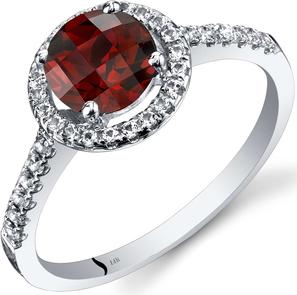 PEORA Garnet Ring for Women 14K White Gold with White Topaz, Genuine Gemstone Birthstone, 1.25 Carats Round Shape 6.5mm, Halo Design, Sizes 5 to 9