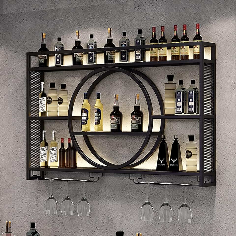 Black/Gold Wine Bottle Holder For Home Bar, Wine Kitchen Storage, Metal Wine Rack Bar Shelves 3 Tier Wall Mounted With Wine Glass Holder Liquor Shelf For Liquor Bottles For Home Bar & Dining Room(Blac