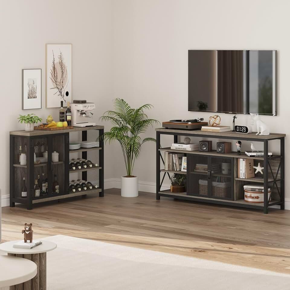 BON AUGURE Liquor Cabinet Bar for Home, Coffee Bar Cabinet with Storage, Tall TV Stand for TVs up to 65 Inch, Industrial Entertainment Center for Living Room and Bedroom (Grey Oak)