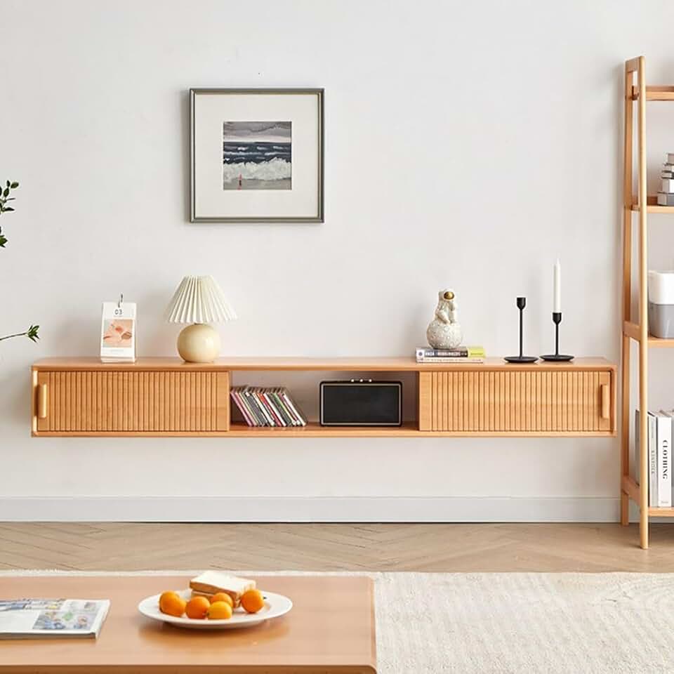 OOCCO Floating tv Stand Wall Mounted with 2 Drawers, Sliding Door Entertainment Center with Storage, Wood Floating Shelf for Under tv, fit for a Bedroom or Any Small Space(Wood Color)