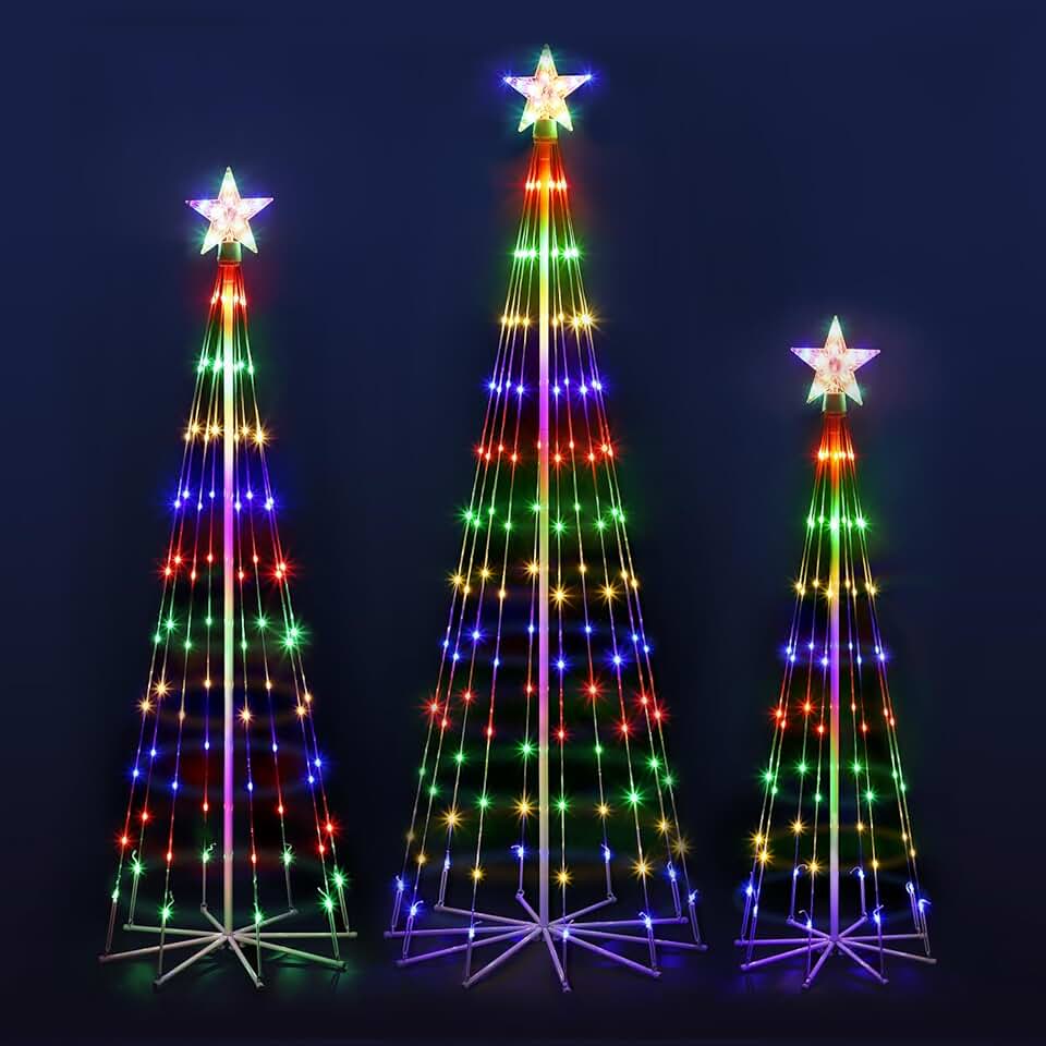 OUSHENG 3 Pack LED Outdoor Christmas Tree Light Show Decorations, Outside Lighted Cone Xmas Decor with Star Toppers for Yard Porch Backyard Patio, 4 Colors, 4ft 5ft 6ft