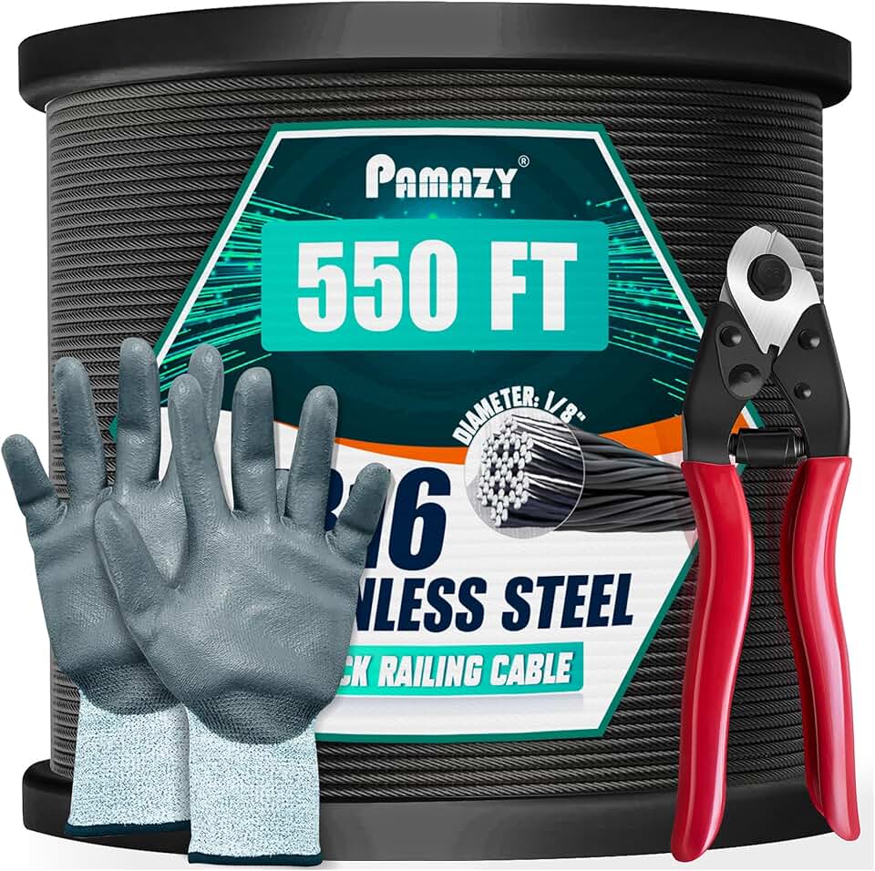 550FT 1/8” Black T316 Stainless Steel Deck Cable Railing Kit with Cutter & Gloves, 7x7 Strands Construction, Cable Railing Hardware System, Wire Rope Aircraft Cable for Wire Fence