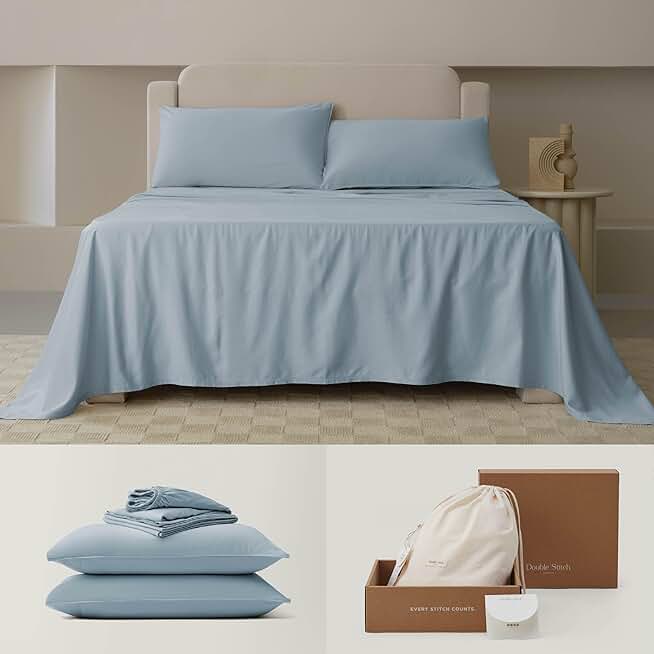 Double Stitch by Bedsure Cotton Tencel Sheet Set - Good Housekeeping Award Winner, Queen Sheet Set Cooling, Soft Luxury Bedding Set, 1 Fitted Sheet, 2 Pillowcases, Sterling Blue