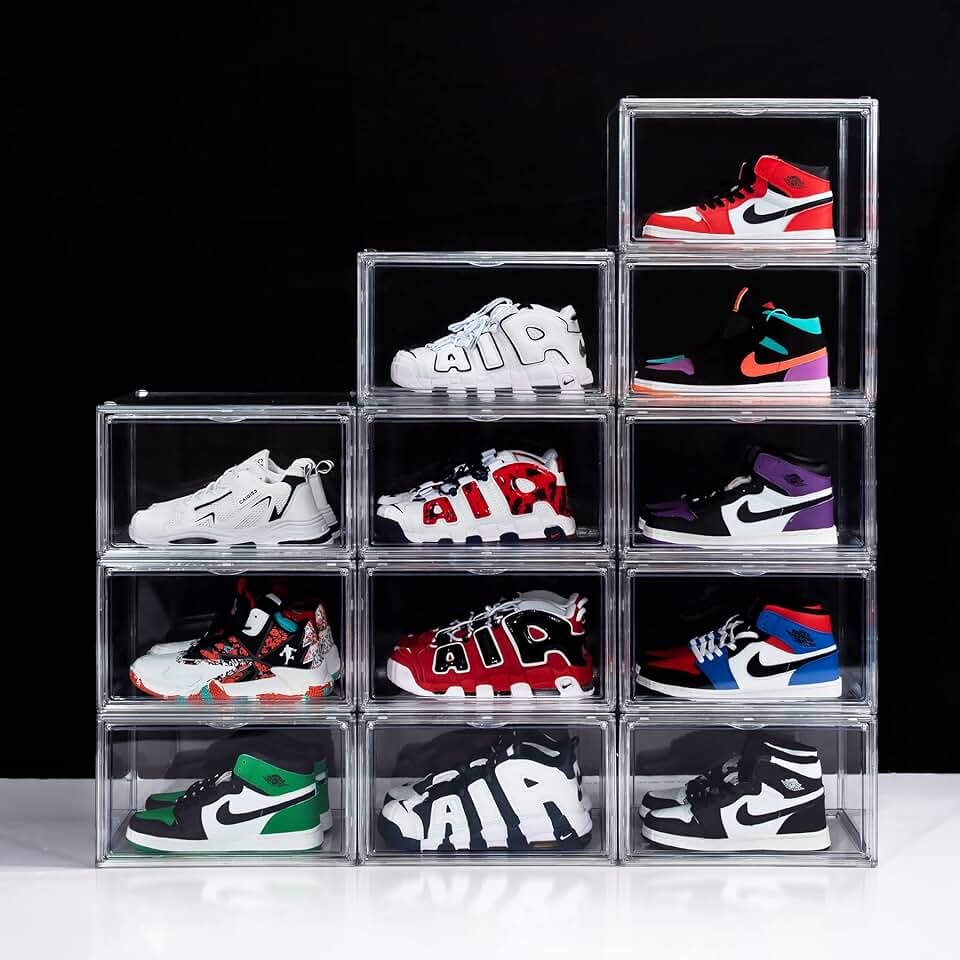 12 Pack Shoe Boxes, Clear Acrylic Plastic Shoe Boxes Stackable, Space-Saving Foldable Drop Front Shoe Storage Boxes Container for With Lids Fits Up to Size 14 (Crystal Clear)