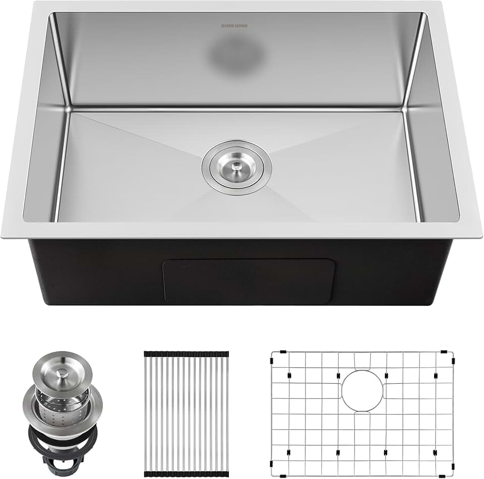 25-inch Undermount Kitchen Sink, SINKVINE Stainless Steel Single Bowl Indoor and Outdoor Sink, Tight Radius Laundry Sink with 3.5" Drain Strainer, Bottom Grid Protector, Roll-up Drying Unit, 25 x 18