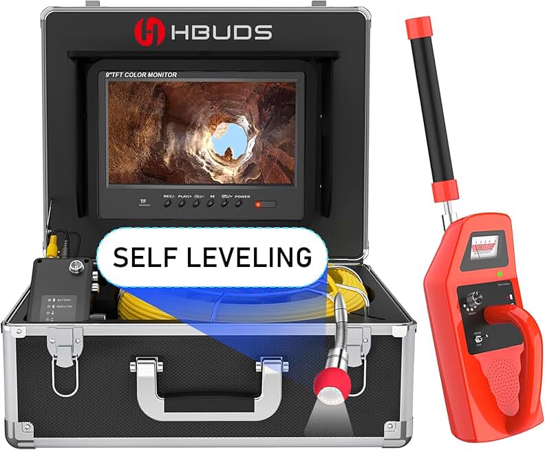 Self Leveling Sewer Inspection Camera with Locator 165ft, 9" Color Monitor Drain Pipe Cameras with 512Hz Sonde and Receiver, 12V 4500mAh Rechargeable Battery Plumbing Camera Snake with DVR 16GB