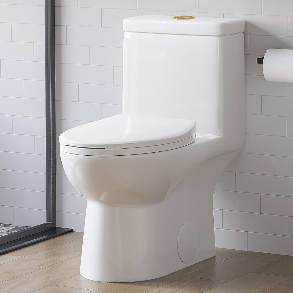 HOROW Elongated One Piece Toilet with Gold Button HR-LT0037WG, Powerful & Quiet Dual Flush Modern Toilet & Soft Closing Seat Include, 12 Rough-In, 27.19"D x 14.63"W x 29.32"H, White Toilet Bowl