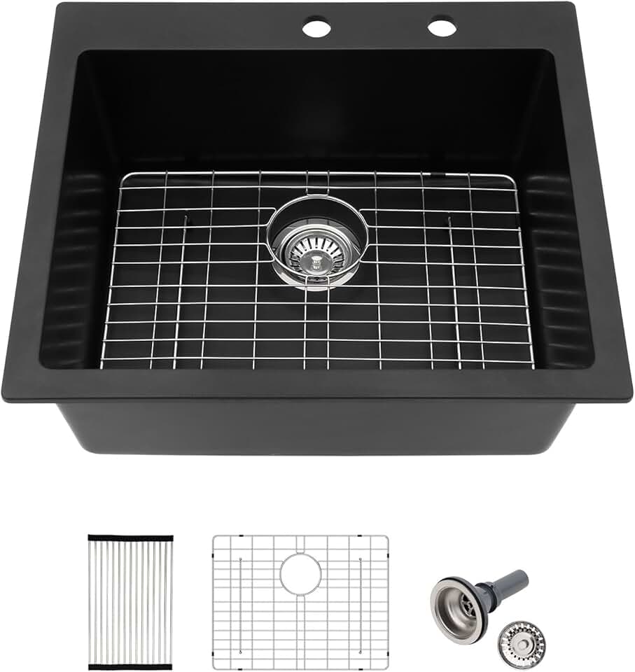 25x22 Inch Black Granite Composite Drop In Kitchen Sink Top mount Quartz Single Bowl Contemporary Kitchen Deep Sink Basin with Counter Ledge