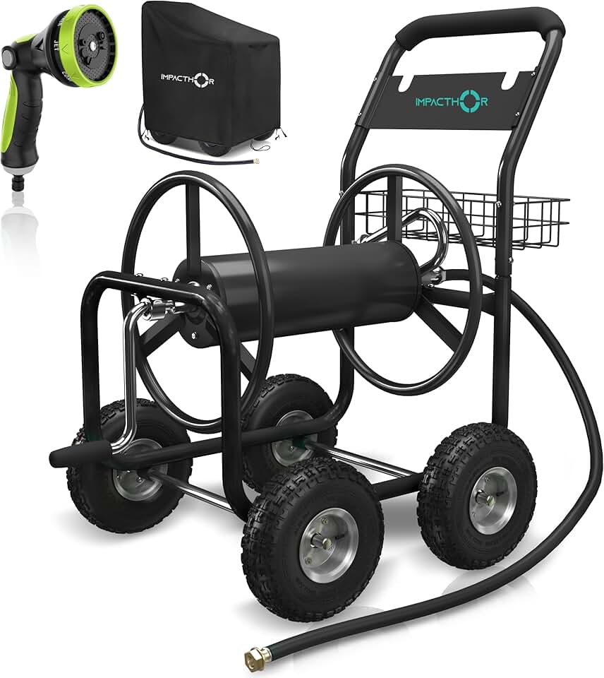 Garden Hose Reel Cart - 4 Wheels Heavy Duty Hose Cart, Nozzle & Waterproof Cover Cart Included - Holds up to 250 Feet 5/8 Inch Hose