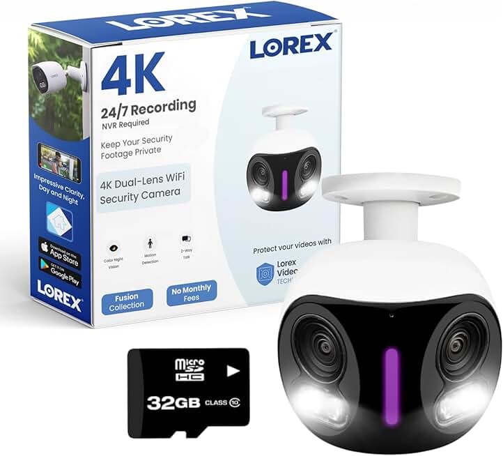 Lorex 4K Dual-Lens Indoor/Outdoor WiFi Security Camera with Smart Security Lighting, 32GB (White)