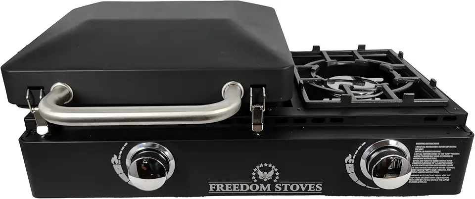 Freedom Stove 22" Easy Clean Non Stick Ceramic Coated Flat Top Propane Gas Griddle With Locking Lid Includes Utensils, Cover, LP 1LB & 20LB Adapters for Outdoor Cooking, Camping (22 Inch w Sideburner)