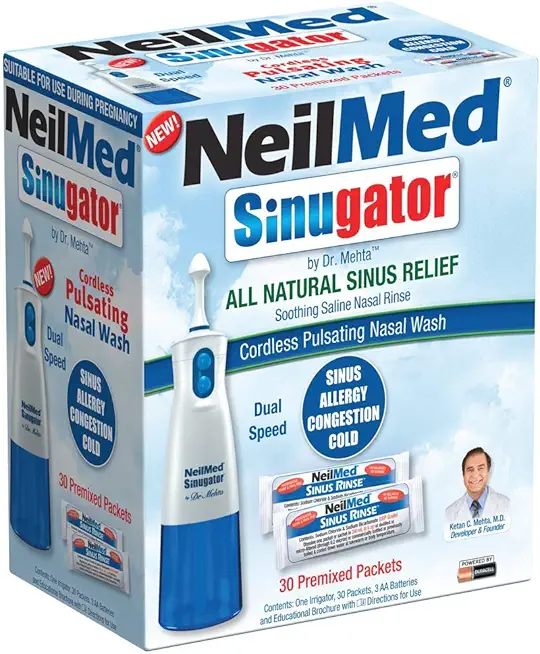 NeilMed Sinugator Cordless Pulsating Nasal Wash Kit with One Irrigator, 3 AA Batteries, 30 Premixed Packets (Pack of 36)
