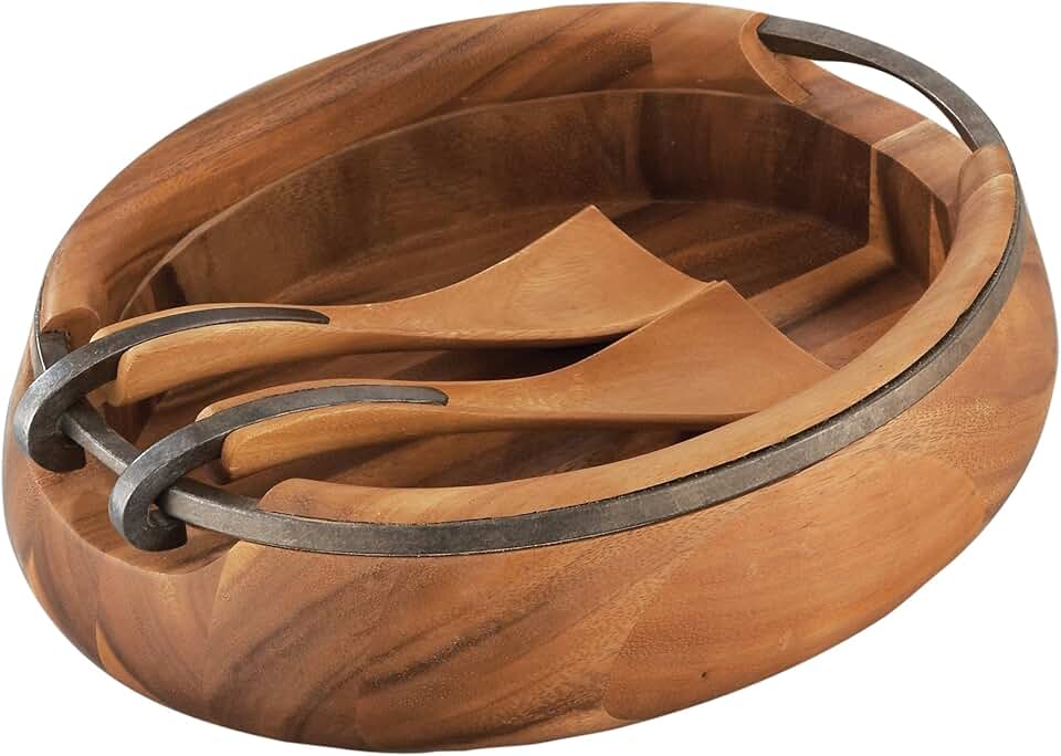 nambe Anvil Salad Bowl with Servers | Large Wooden Serving Bowl for Fruit, Salads | Made of Acacia wood and Iron Finished Nambe Alloy | Designed by Neil Cohen