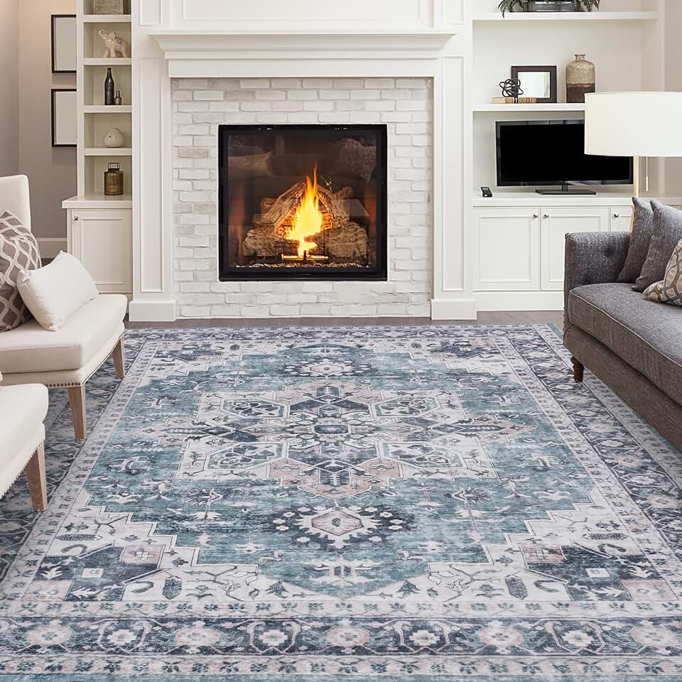 Washable Rug 8x10, Machine Washable Area Rugs with Non Slip Bottom, Vintage Rug for Living Room Bedroom, Traditional Print Floral Rug Carpet Stain Resistant, Green Navy Boho Rug, 8 x 10 Carpet