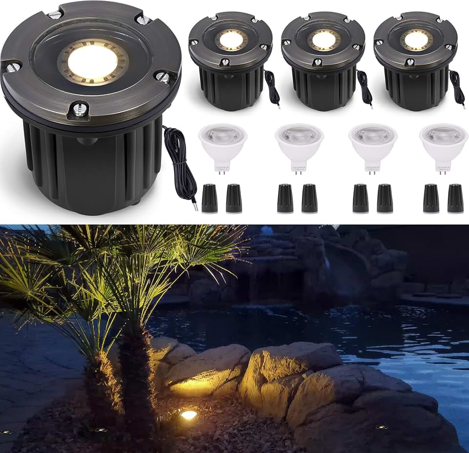 In Ground Well Lights Brass, Low Voltage Landscape Lights Outdoor, LED 12V Waterproof Driveway Lights, Wired Open Top Bronze for Path Tree Patio with 5W 450LM 2700K MR16 Bulb 4 Pack