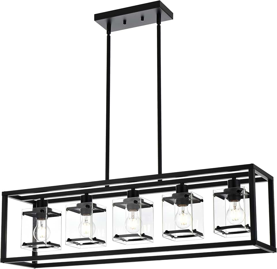 MELUCEE 5-Light Dining Room Light Fixtures Linear Pendant Light Kitchen Island Lighting Contemporary Black Chandeliers for Dining Room Restaurant Bar, Rectangular Clear Glass Shade