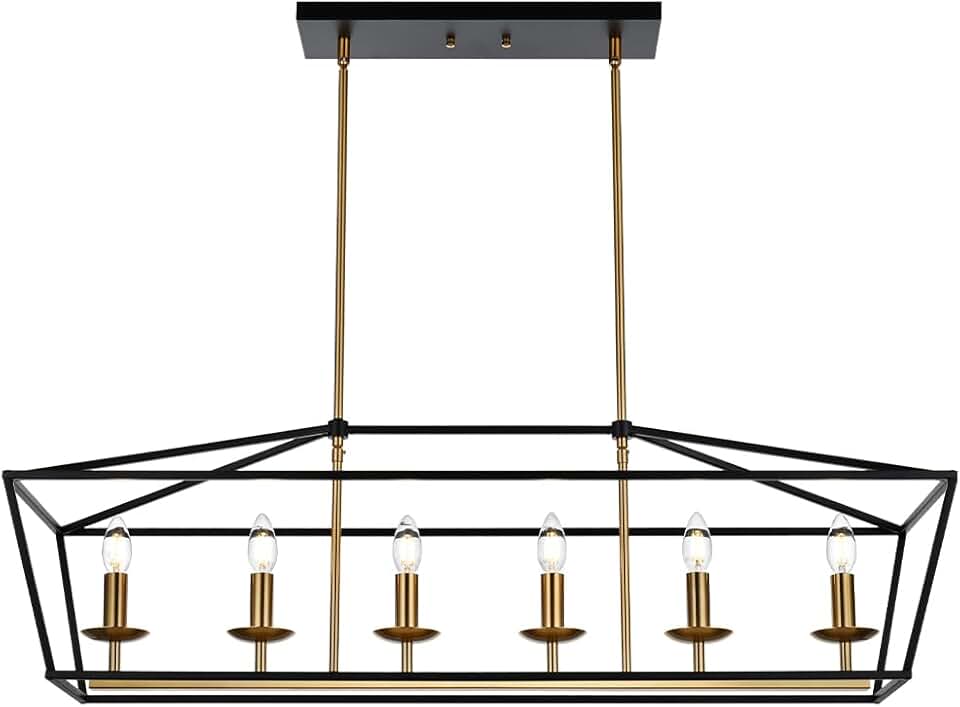 BONLICHT Modern Chandeliers Rectangle 6 Light Dining Room Lighting Fixtures Hanging Over Table,Black and Brushed Brass Kitchen Island Lighting Linear Pendant Light Contemporary Farmhouse Ceiling Light