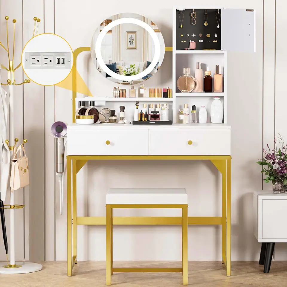 UTEX Makeup Vanity Desk with Mirror and Lights, Makeup Vanity Set with Drawers, Small Makeup Vanity Table, 3 Lighting Modes Dresser Desk and Cushioned Stool Set for Bedroom White and Gold