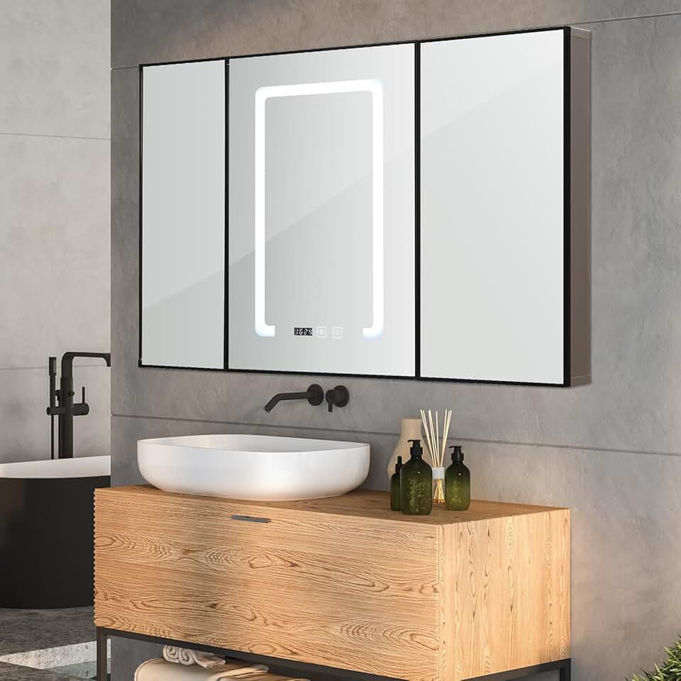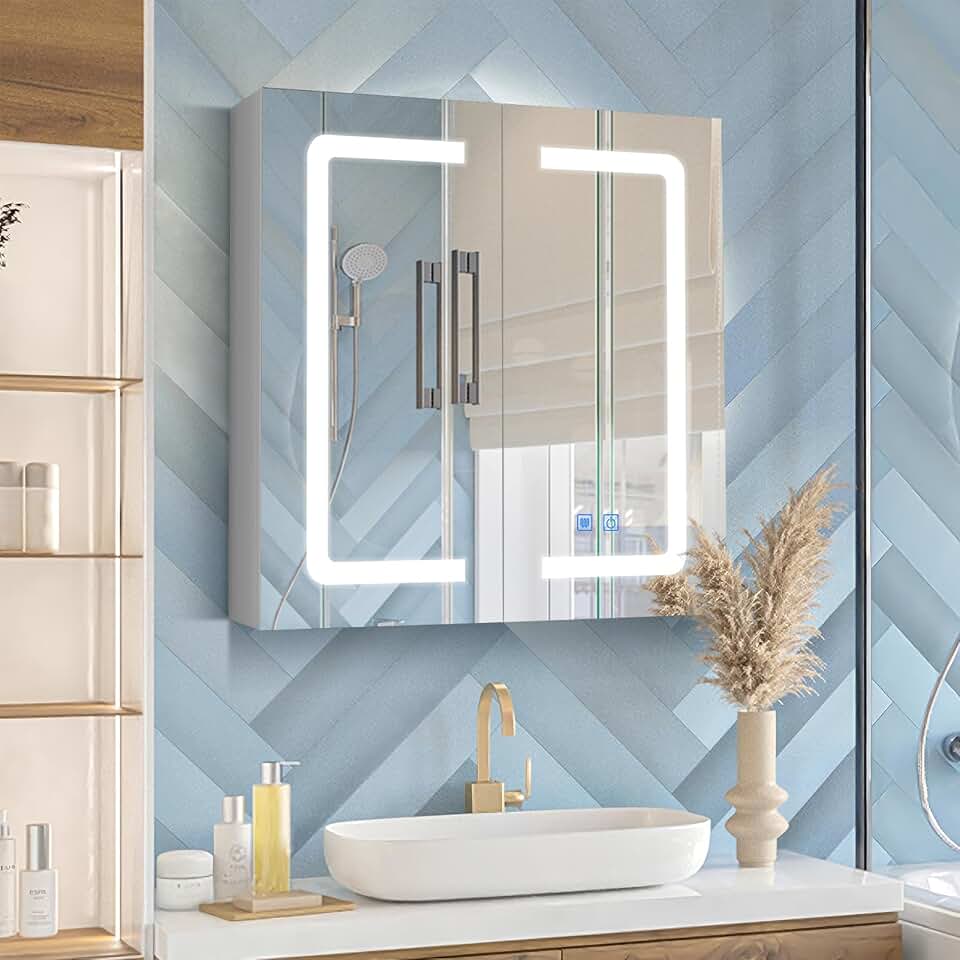 Wenqik LED Mirror Medicine Cabinet, Bathroom Medicine Cabinet with LED Lights and Mirror, Wall Mounted Mirror Cabinet with Dimmer Defogger Clock Room Temp Display Socket (Three Doors)