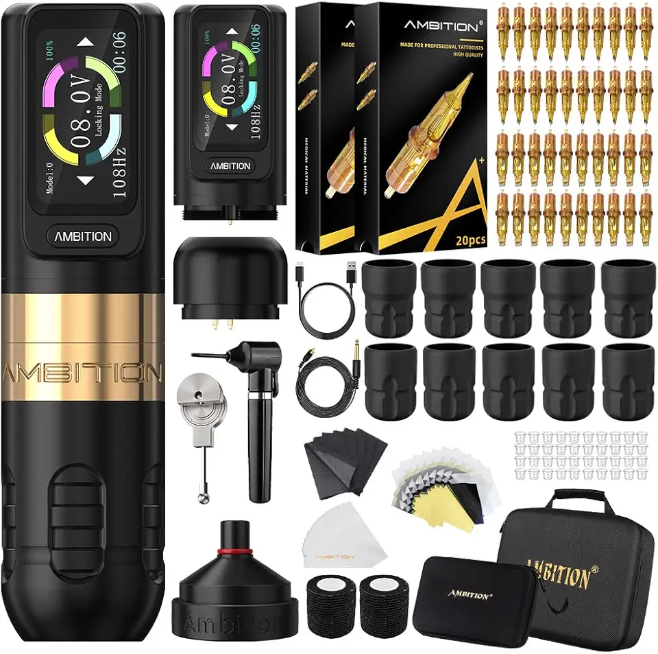 Tattoo Pen Kit-Ambition Zetton Wireless Tattoo Machine Kit Complete with Extra 2400mAh Power 40pc Cartridge Needles Bandage Gloves Ink Mixer Ink Cup Disposable Grip for Professional Tattoo Artists