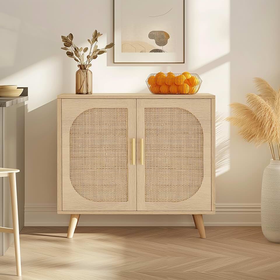 Rattan Storage Cabinet,Accent Bathroom Floor Cabinet,with Two Doors and 4 compartments for Storage,for Living Room, Bathroom,Entryway and Kitchen(Natural Wood Color)