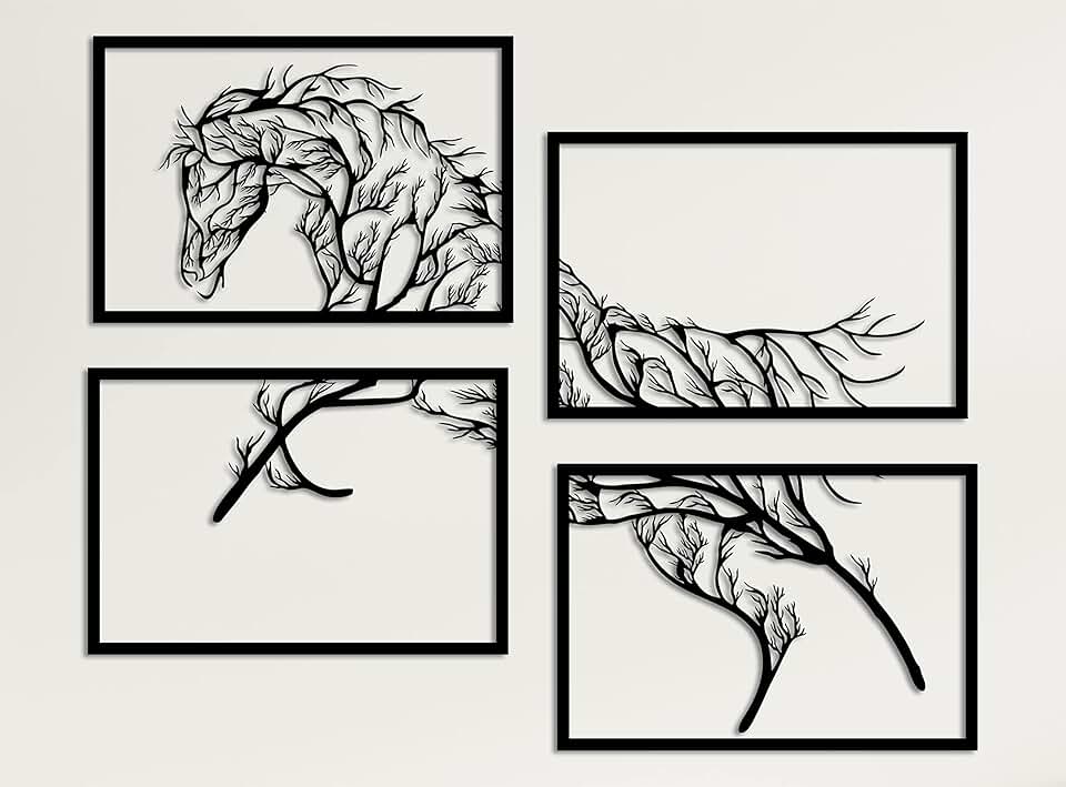 DEKADRON Metal Wall Decor,Tree Horse 4 Panels, Home Living Room Decor, Wall Sign, Metal Wall Art, Interior Decoration, Indoor Outdoor Hangings, (*30" W x 20" H / 75x51cm Each Panel Dimensions)