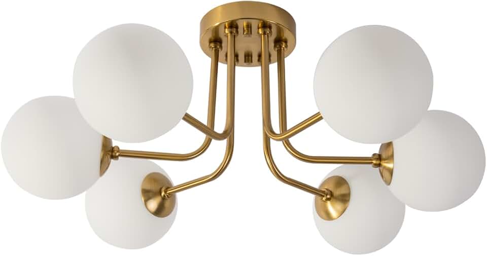 Modern Semi Flush Mount Ceiling Light 6-Light,Globe White Glass Shade Semi Flush Mount Ceiling Light Sputnik Chandeliers for Bedroom Living Room Hallway Dining Room Lighting Fixture