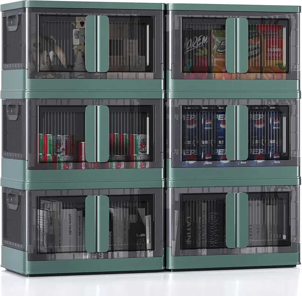 8.4 Gallon Collapsible Storage Bins with Lids, 6 Pack - Stackable Storage Bins with Doors and Wheels, Plastic Storage Cabinet for Easy Storage and Organization, Green