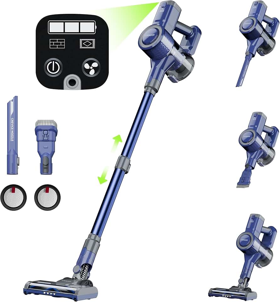 E1 Cordless Vacuum Cleaner - Brushless Motor, Rechargeable, 35min Runtime on HardFloor, 18min on Carpet, Removable 2000mAh 22.2V Li-ion Battery, Motorized Brush, LED Headlight, Telescopic Tube