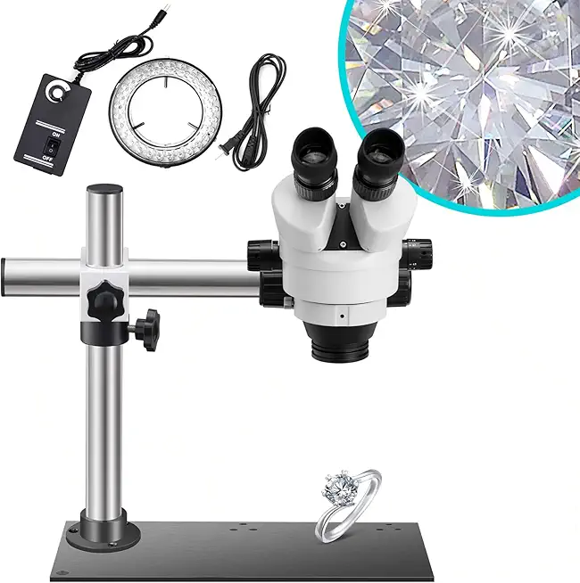 DZQ Stereo Microscope 7X-45X Magnification, Jewelry Microscope 0X/0.5X/2.0X Objective Lenses, Micro Inlaid Mirror WF10X Eyepieces, Single-Arm Boom Stand with Base Plate, 60-Bulb LED Ring Light(ZQ-3)