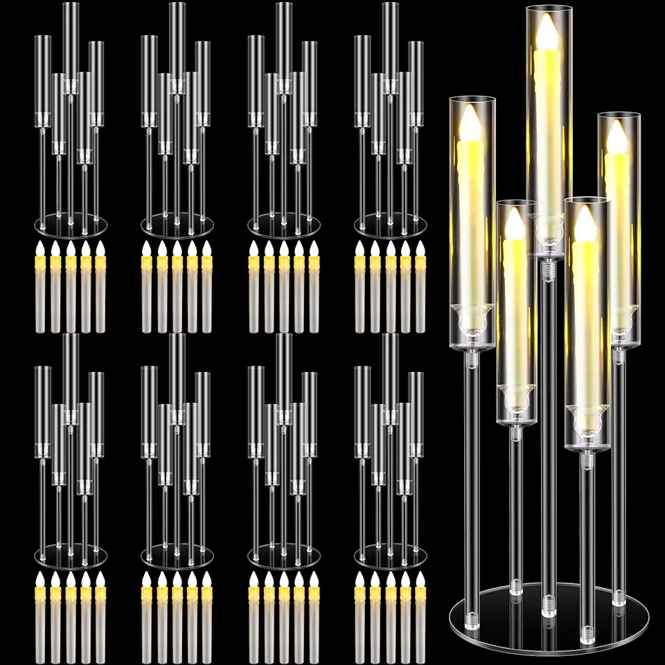 5 Arm Acrylic Clear Candelabra Centerpieces for Tables Candle Candelabra Candlesticks Holders with LED Candles and Shade for Wedding Holiday Birthday Party Fireplace Decoration(8 Sets)