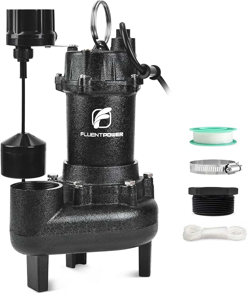 FLUENTPOWER 3/4HP 5000GPH Sewage Effluent Pump, Cast Iron Ejector Submersible Sewer Pump, with Automatic Vertical Float Switch for Basement Residential Septic Basin, 10 ft Cord, 2" NPT Discharge