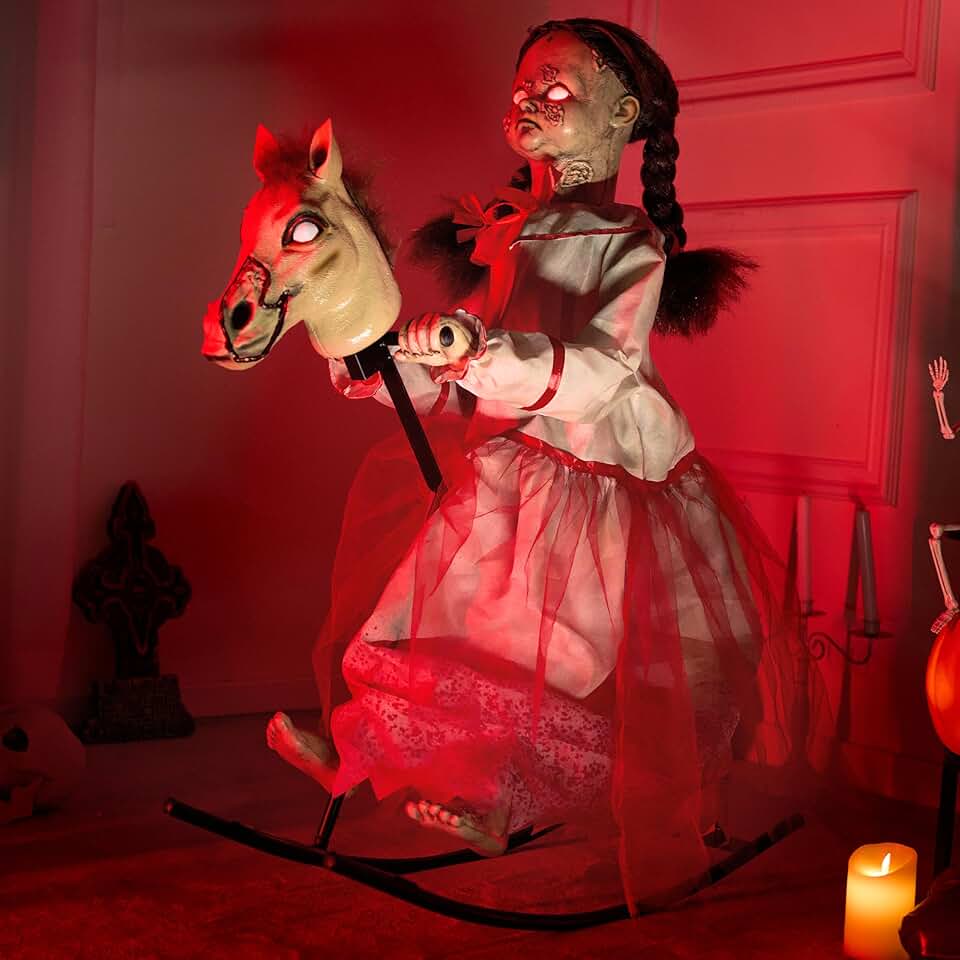 JOYIN 3 Ft Halloween Animatronics Rocking Horse Doll, Halloween Decorations with Motion & Light & Sound, Sound Activated Scary Girl Decor for Halloween Party Supplies Haunted House Yard Lawn Outdoor
