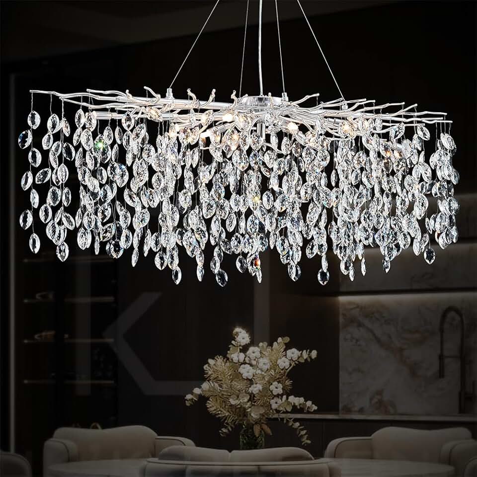L47.2 inch Rectangle Modern Crystal Chandeliers, Silver Tree Branch Chandelier Lighting Large Ceiling Hanging Light Fixtures for Living Dining Room, Foyer, Kitchen Island