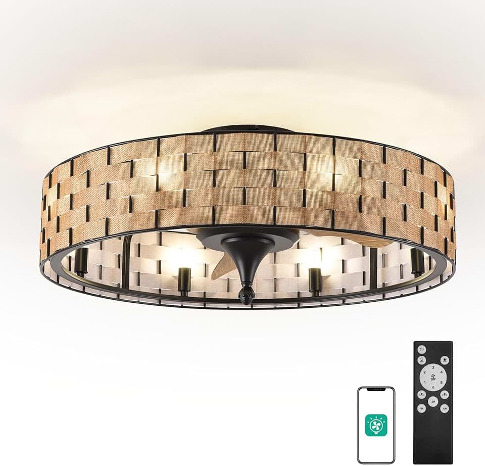 Orison 24" Caged Ceiling Fan with Lights, Flush Mount,2 Ways Control(App&Remote Control), Light Kit Included(8 Bulbs), Modern Farmhouse, F61380S