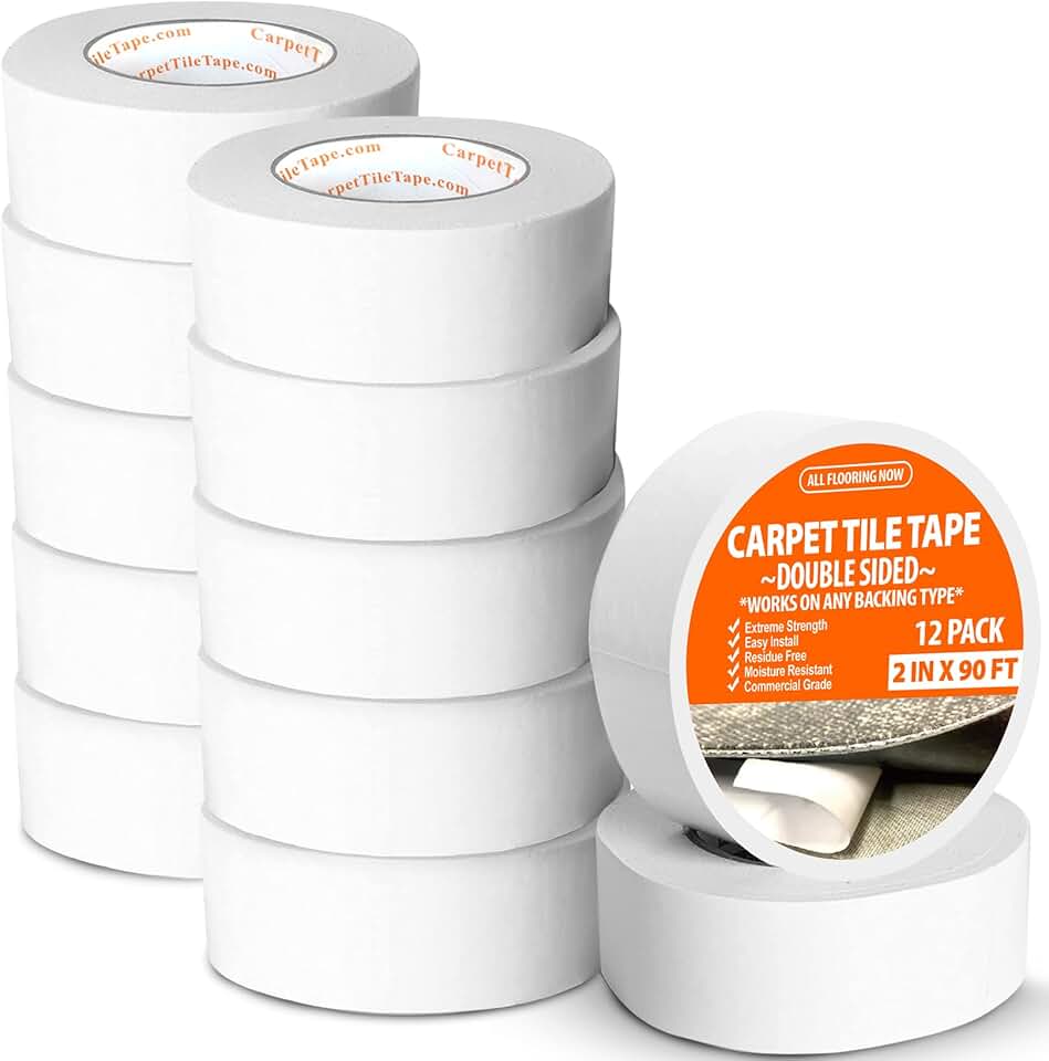 Double Sided Tape Heavy Duty Carpet Tile Tape 2in x 90ft (Bulk 12 Pack) for Carpet Tiles Rug Tape Rug Gripper Indoor Outdoor Carpet Grip Tape Turf Tape Double Stick Tape Two Sided