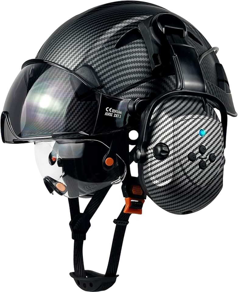 Carbon Fiber Pattern Matte Black Safety Helmet with Bluetooth Ear Muffs with Visor Hard Hats Mounted Ear Muffs OSHA