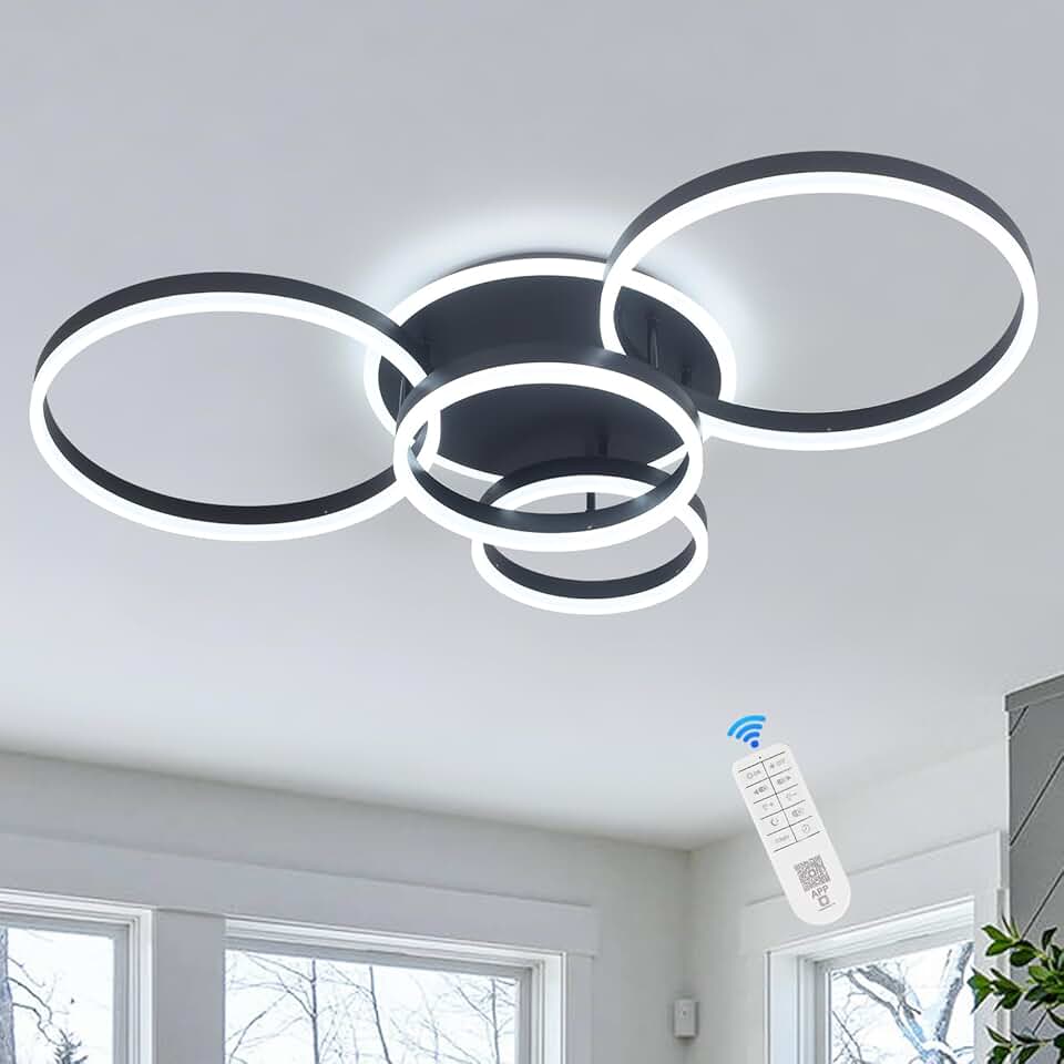 4-Rings Modern LED Ceiling Light Dimmable 39’’ Black Ceiling Lamp with Remote for Living Room, Metal Circle Flush Mount Chandelier Lighting for Dining Room(110W 3000K-6500K)