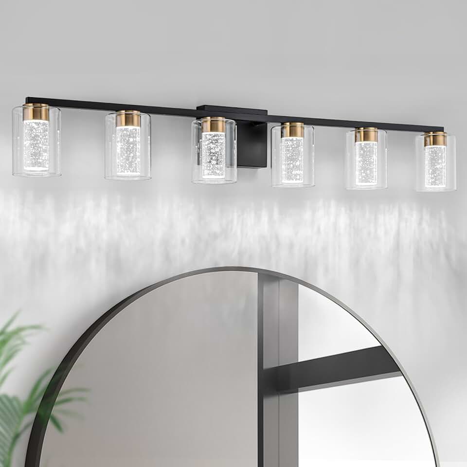 SineRise 6-Light Black and Gold Vanity Light with 3 Color Modes (3000K/4000K/6000K), Eye Protection LED Bathroom Light Fixture, Dimmable Modern Wall Light Over Mirror with Clear Glass Shade