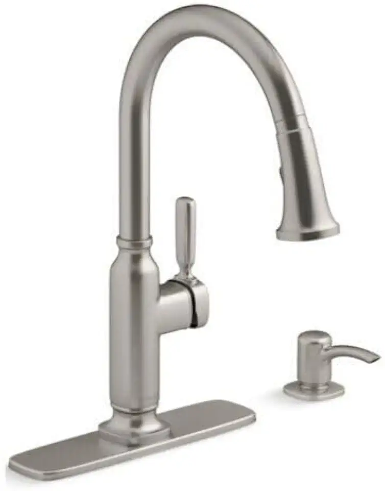 KOHLER Ealing Vibrant Stainless Single Handle Pull-Down Kitchen Faucet with Sprayer (Deck Plate and Soap Dispenser Included), R28703-SD-VS