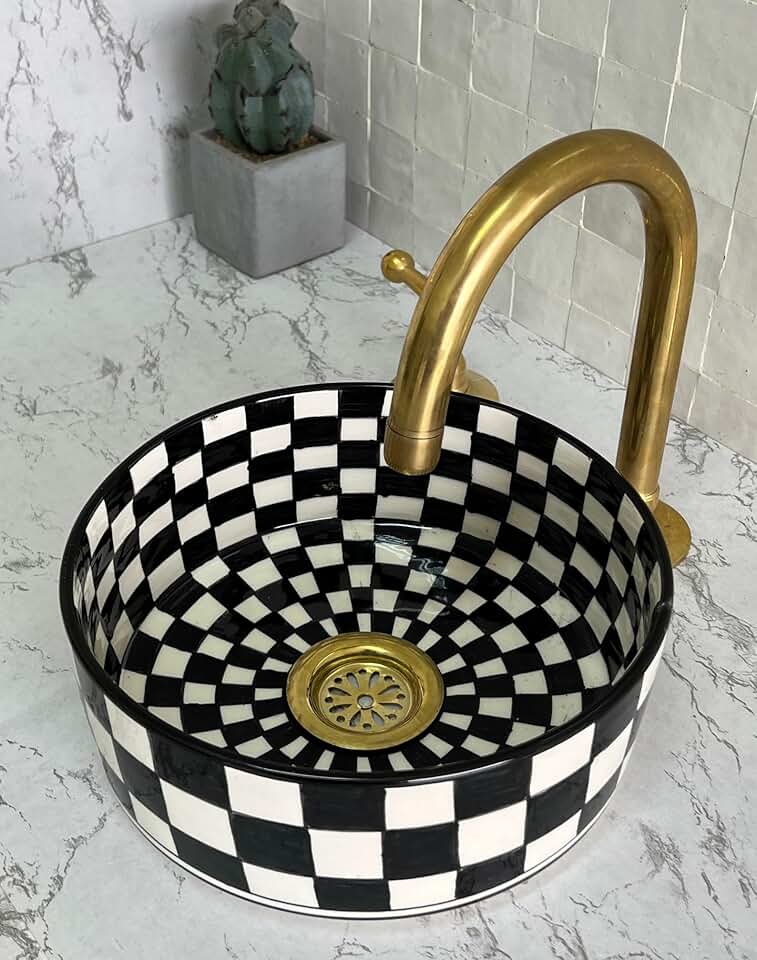 Handmade Countertop Ceramic Wash basin, Checkered Sink Bowl, Hand Painted Above Counter Vessel Sink, Farmhouse Bathroom Ceramic Basin with two gifts (10"= 25cm, Black & White)