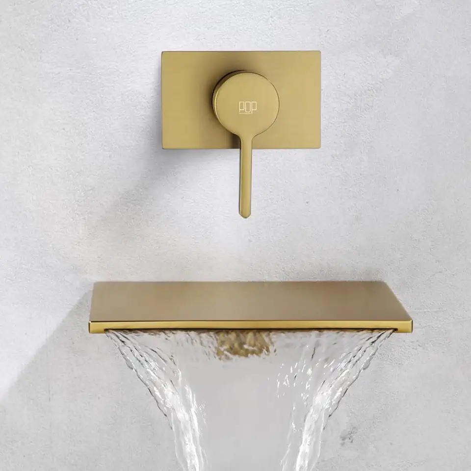 POP SANITARYWARE Wall Mounted Waterfall Bathtub Faucet Brushed Gold Single Handle Tub Filler Faucet with Valve