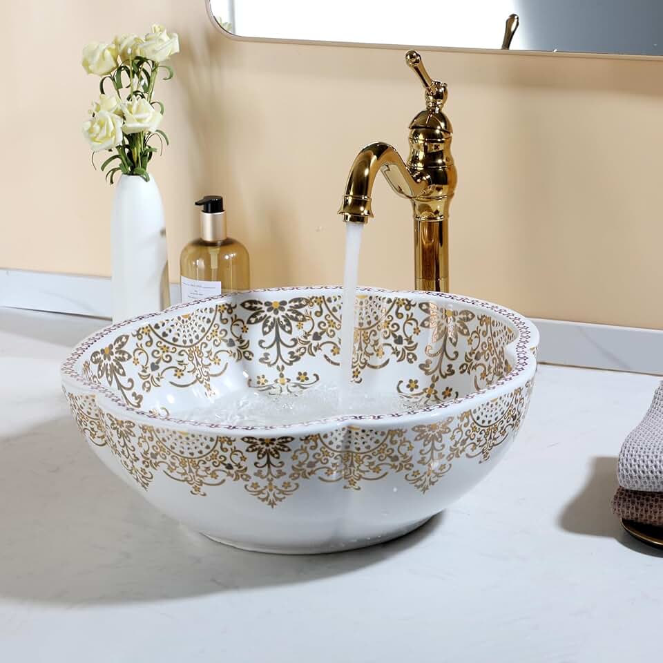 Sinku Mccut Ceramic Bathroom Sink Flower Pattern,Small Vessel Sink with Faucet and Drain Combo,Modern Artistic Above Counter Sink Basin,White Vanity Sinks for Bathroom Round