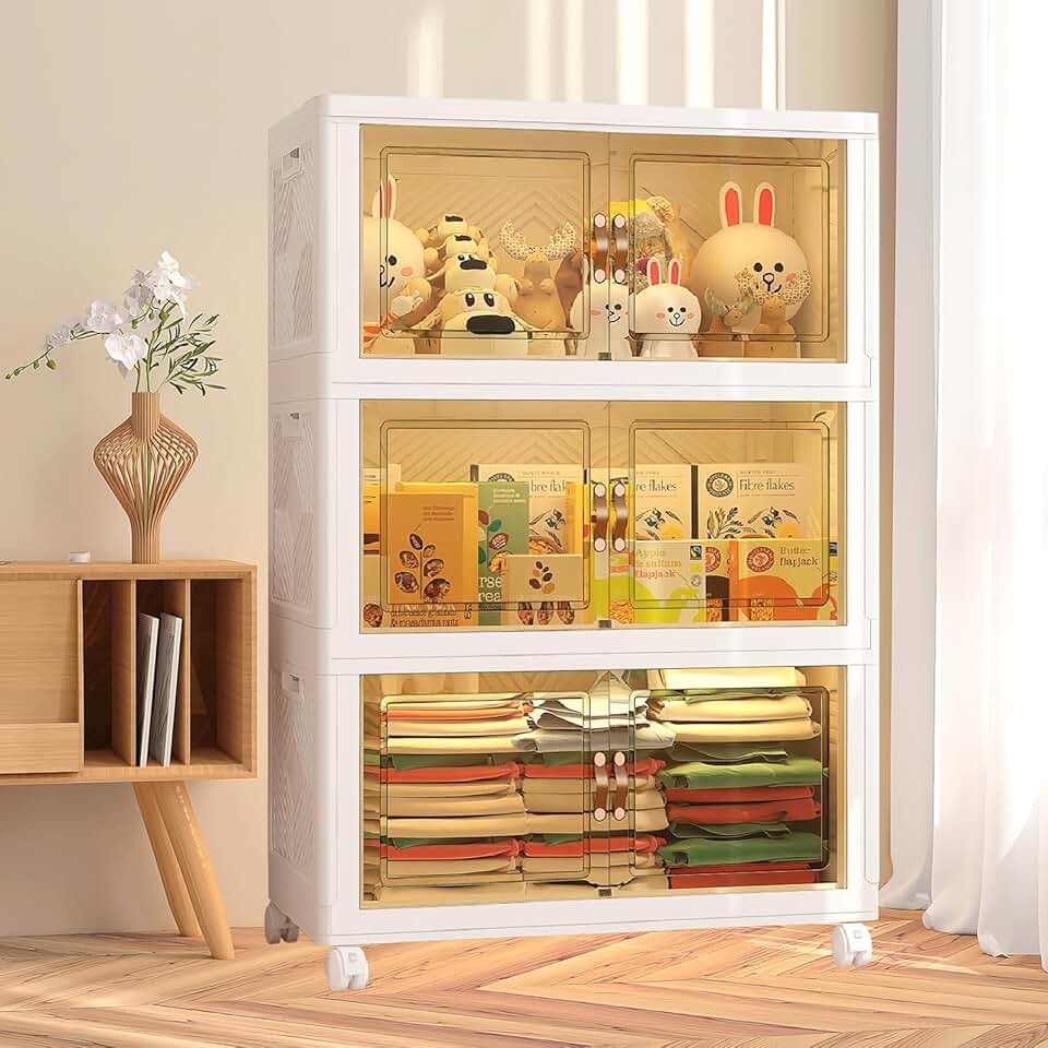 Plastic Drawer Storage Bins with Lid, Stackable Storage Bins Open Front, Closet Organizers and Storage Cabinet with Doors and Shelves, Collapsible Storage Bins with Wheels (3 Layer-28 Gallon)