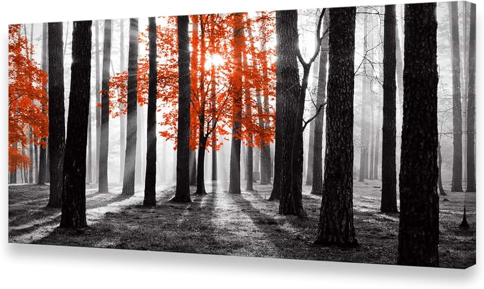 Cao Gen Decor Art S06675 Wall Art Canvas Painting Red Tree in Black and White Sunshine Foggy Forest Picture Poster Print Framed and Stretched Ready to Hang for Living Room Bedroom Office Home Decor