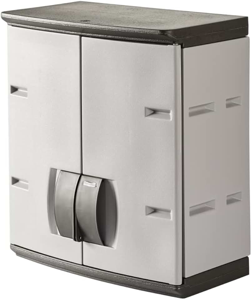 Rubbermaid Wall Mounted Storage Cabinet with Doors, 150-Pound Capacity, Gray, Lockable, Three-Shelf Cubbard for Tools/Car Accessories/Cleaning in Home/Garage/Outdoor Areas