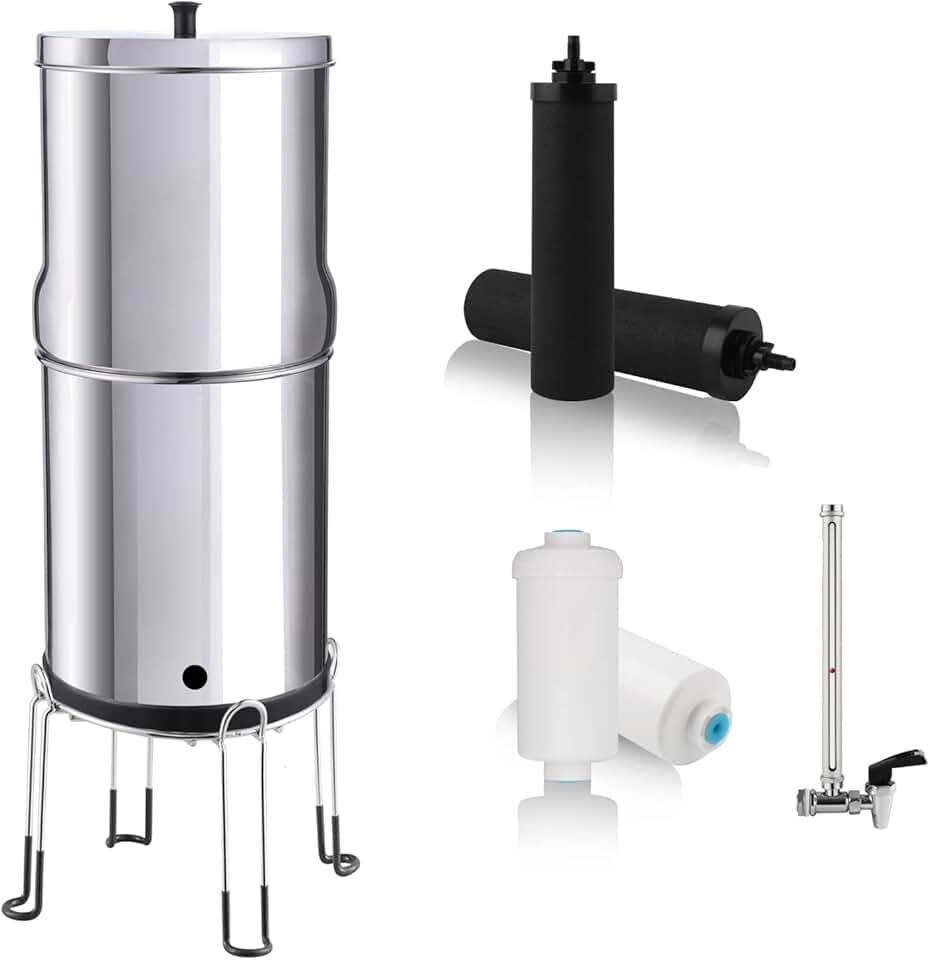 Amwater NSF/ANSI 42&372 Certification 3G Stainless Steel Gravity-Fed Water Filter System, Reduces Lead and up to 99% of Chlorine,with 4 Purification Filter,Sight Glass Spigot and 6inch Stand