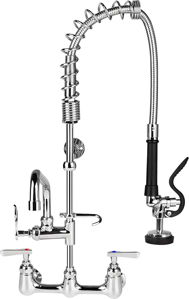 Commercial Kitchen Sink Faucet with Pre Rinse Sprayer 8'' Center 25'' Height 12'' Swivel Spout Adjustable Wall-Mount Kitchen Faucet for 1, 2, 3 Industrial Restaurant Compartment Utility Sinks